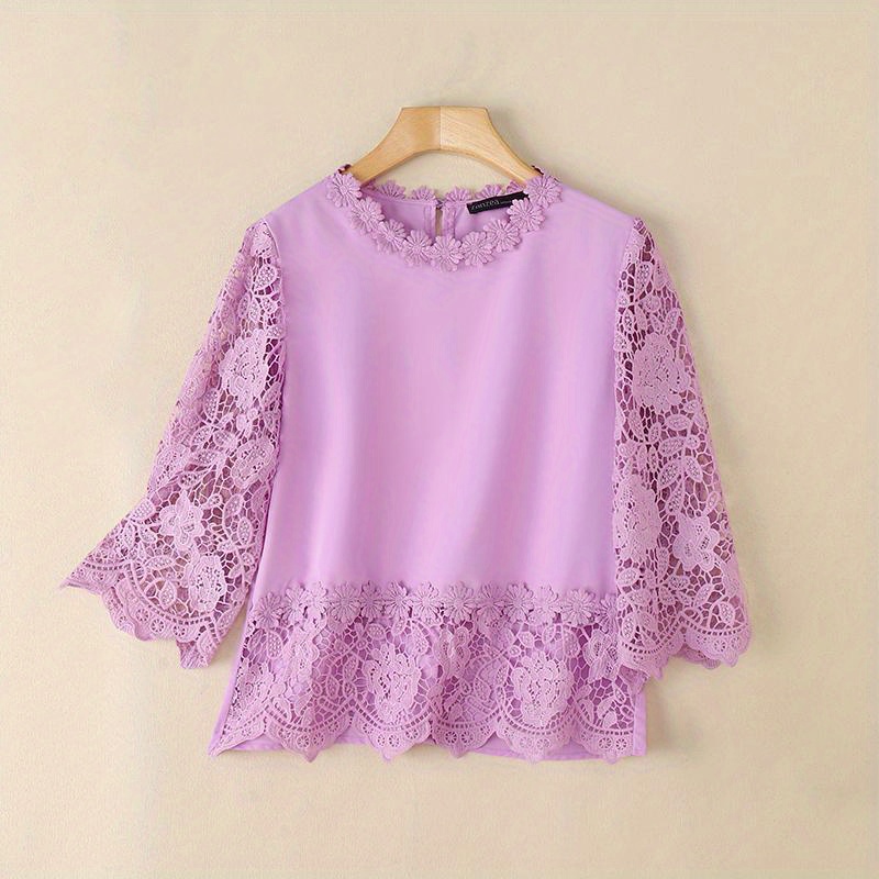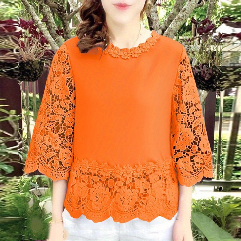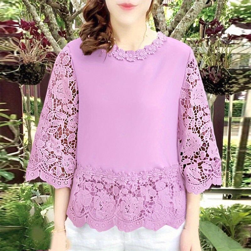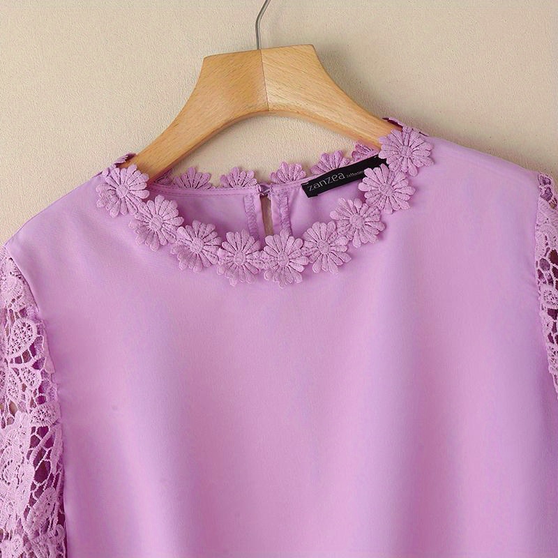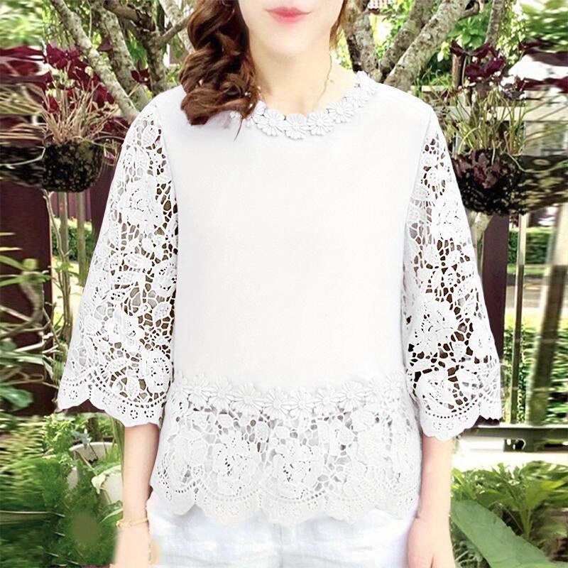[Elegant Oversized Blouse] Plus Size, ZANZEA Women's Plus Size Elegant Oversized Blouse - Lightweight Short Sleeve-Like 3/4 Sleeve Crew Neck Shirt, Wrinkle-Resistant White & Colors, Structured Collar, Machine Washable - Office, Commuter & Casual Wear (No Stretch)