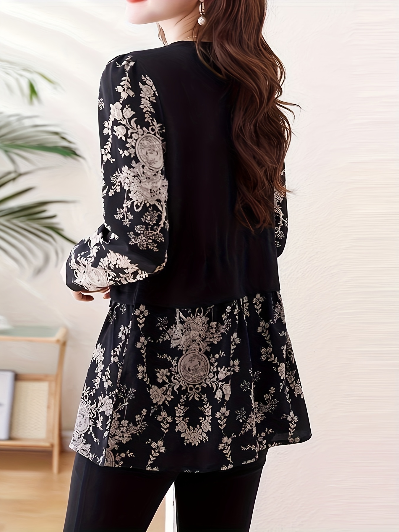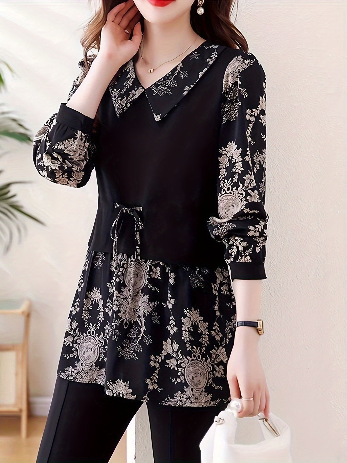 [Floral Print Blouse] Plus Size, Plus Size Floral Print Long Sleeve Shirt - Elegant Loose Fit H-Line Blouse With Contrast Collar & Drawstring Waist, Machine Washable Spring/Fall Top For Women, Casual Chic Wear, Sophisticated Pullover, Quality Casualwear