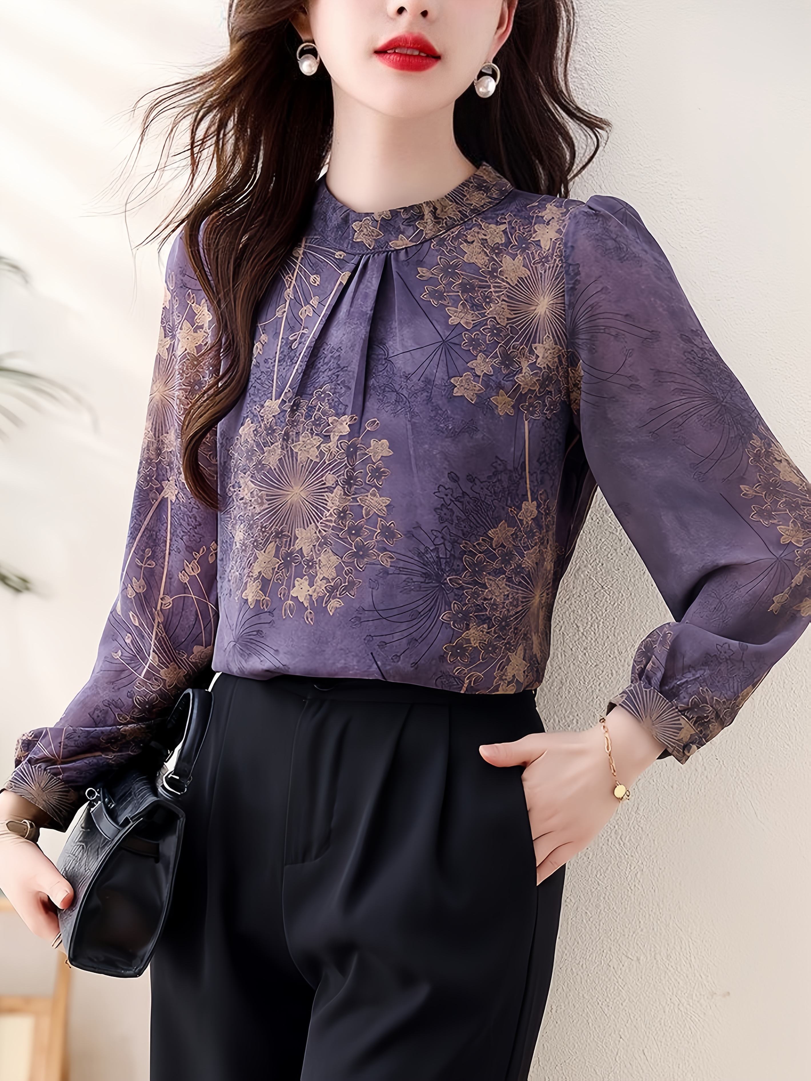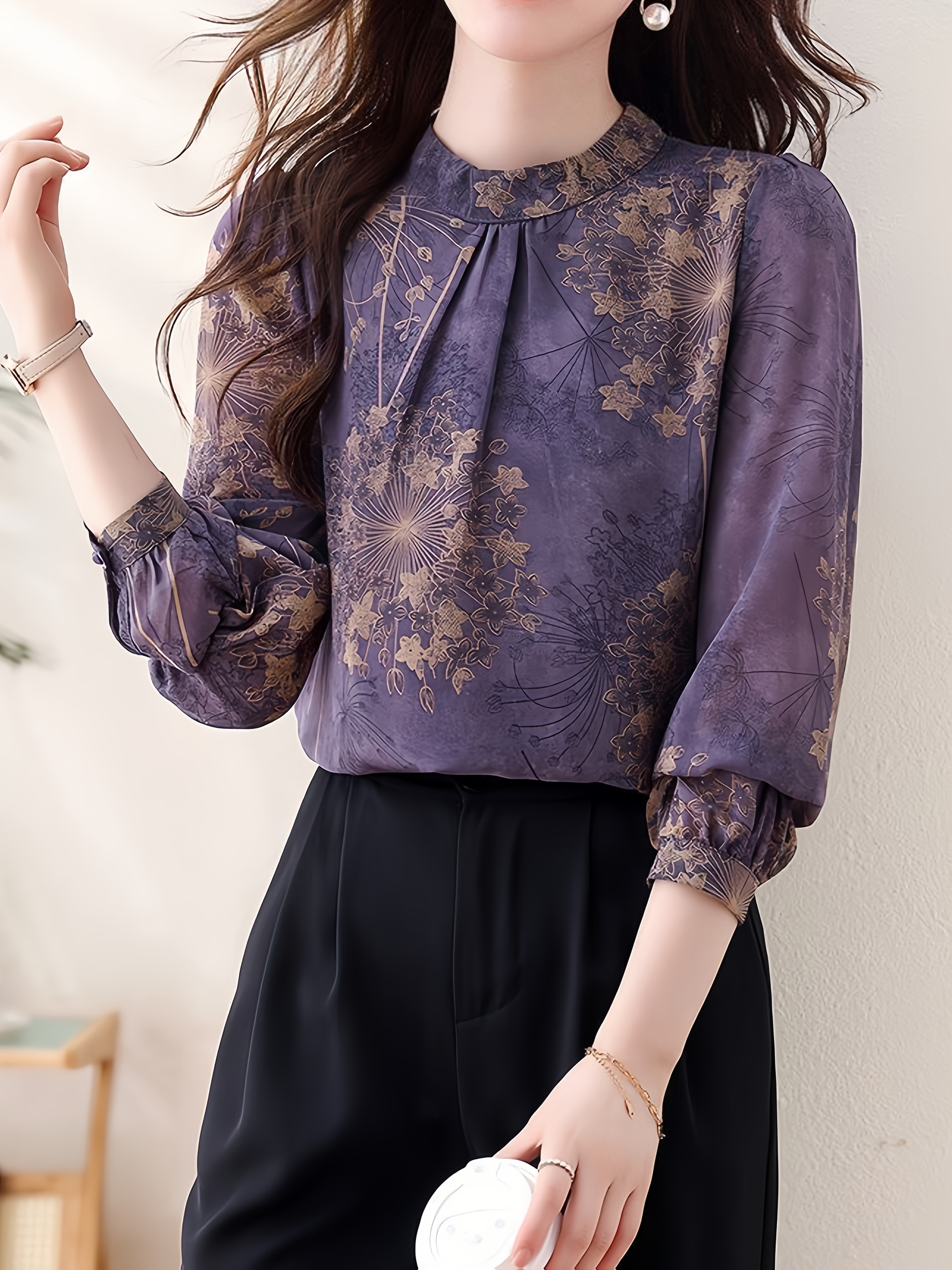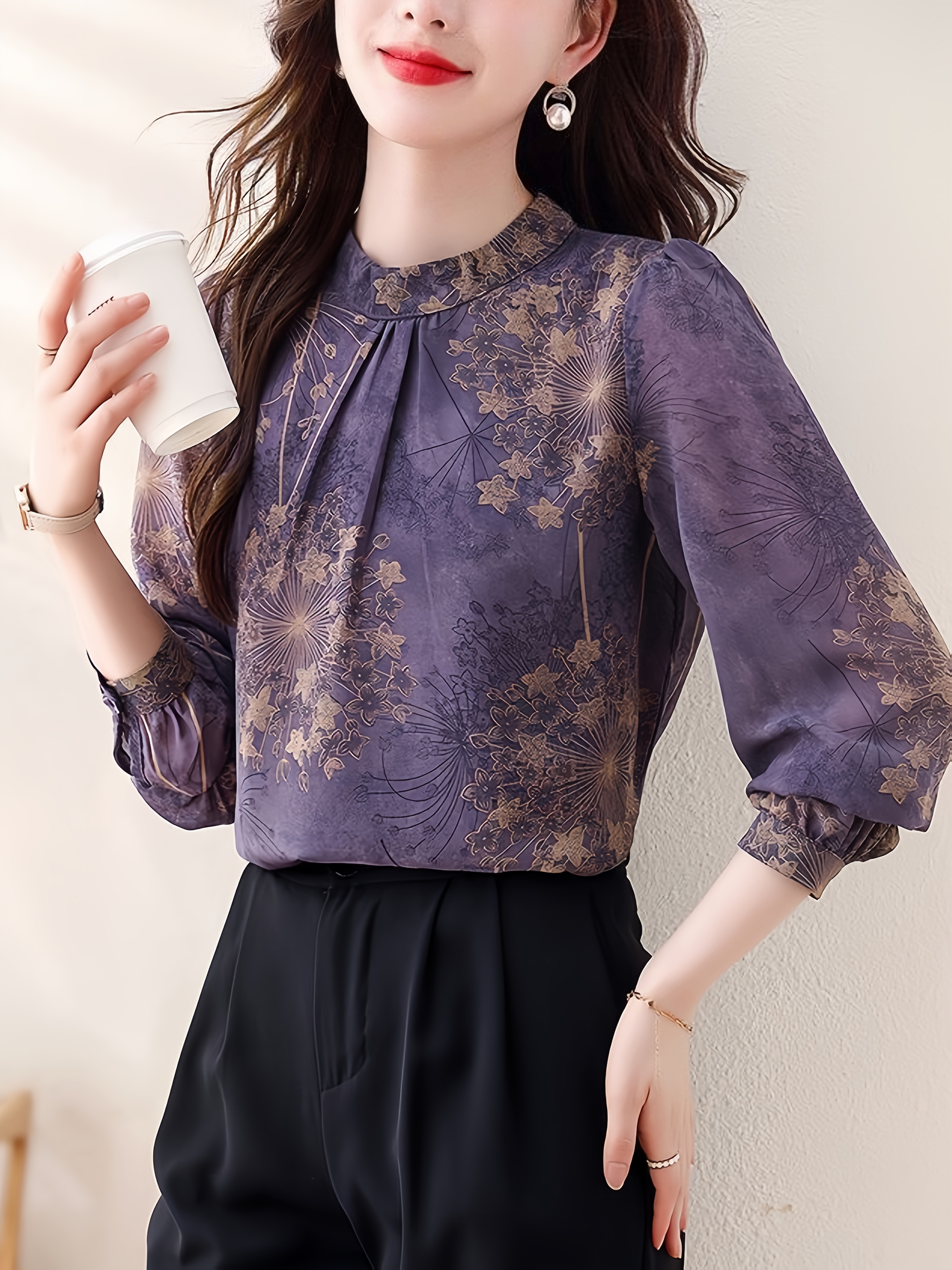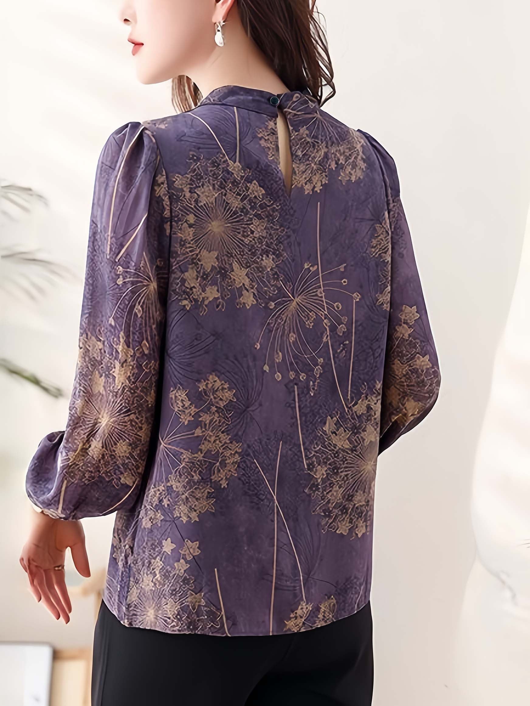 Plus Size - Elegant Long Sleeve Floral Print Blouse for Women - Chic Round Neck, Non-Stretch Fabric, Versatile All-Season Top with Puffed Sleeves, Perfect for Casual or Formal Occasions, Versatile Fashion | Floral Print Blouse | Nonstretch Fabric, Blouse For Women/plus Size/large Size, Women Top And Blouse