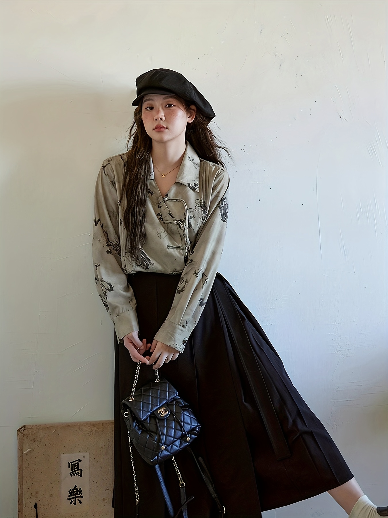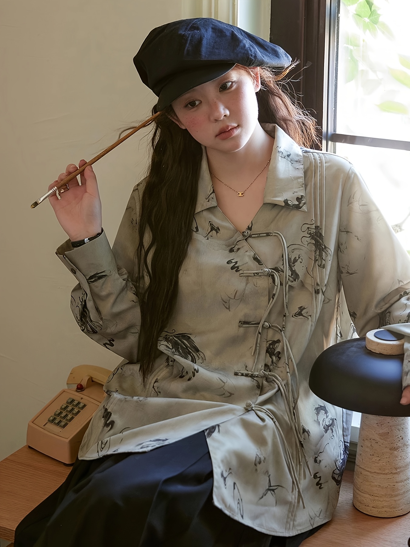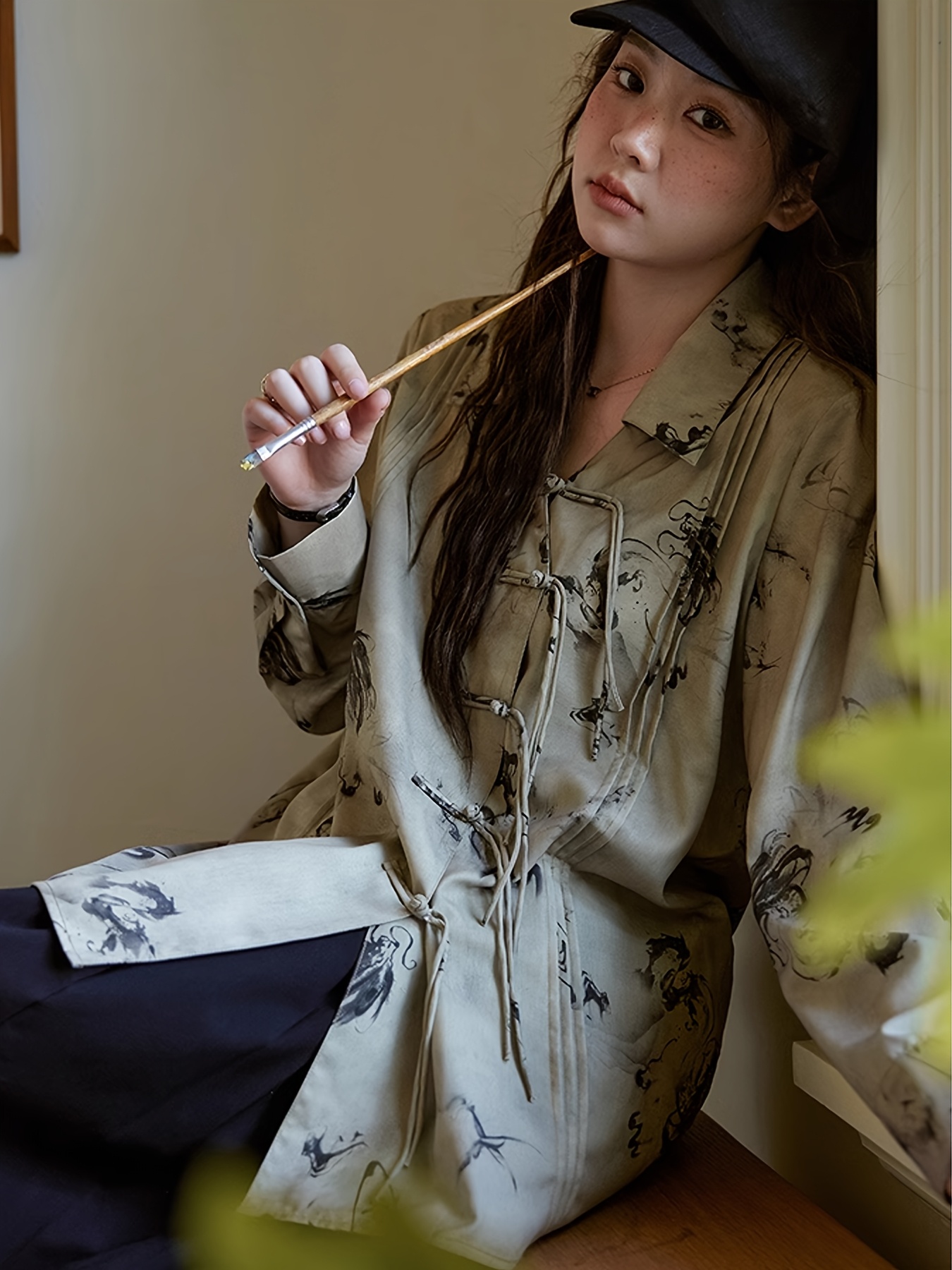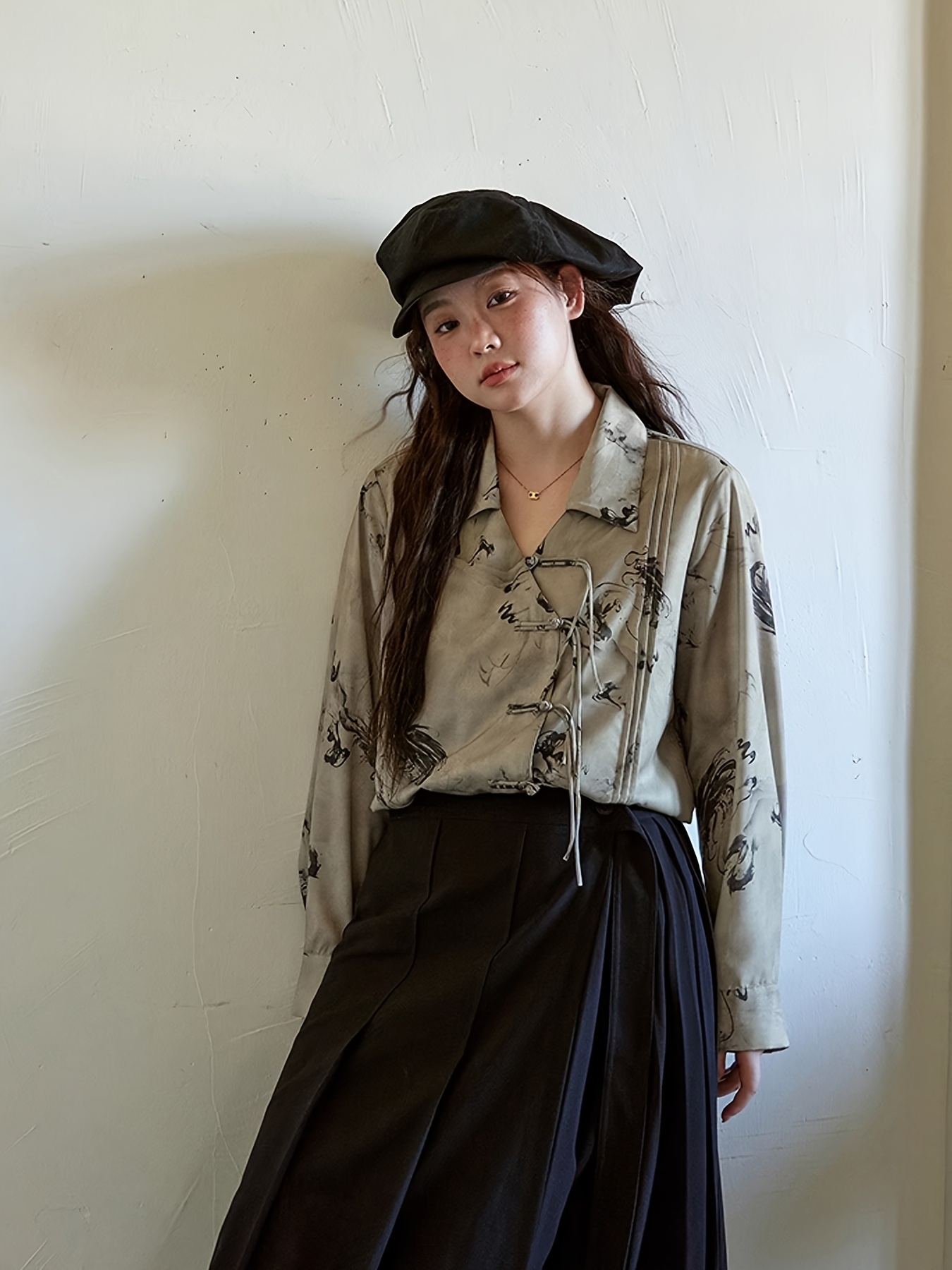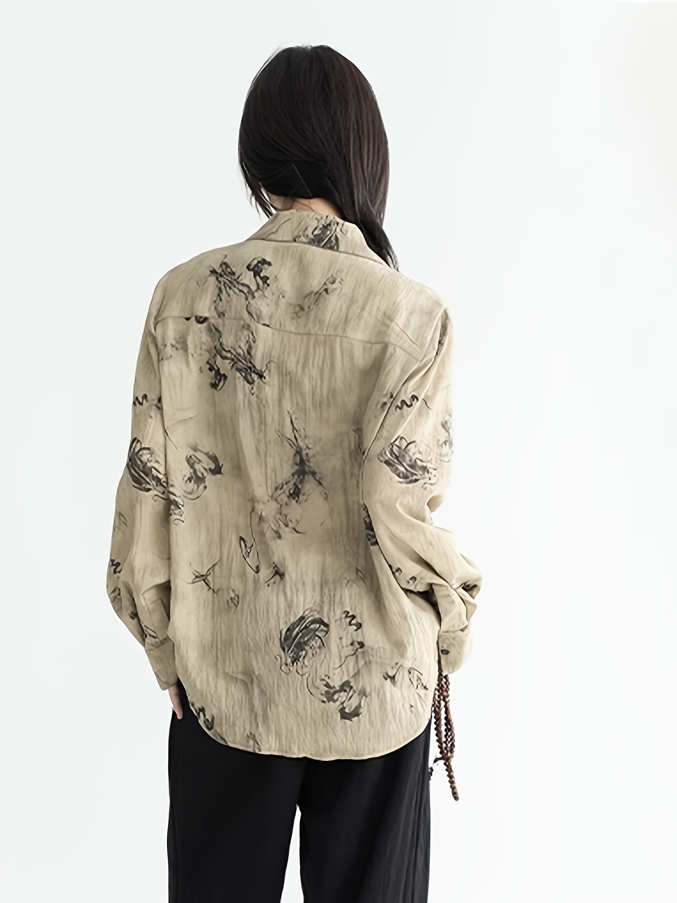 New Chinese Style Ruffle Button-Up Straight Ink Wash Shirt