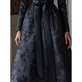 Plus Size, Women's Plus Size Black Floral Jacquard Satin Long Sleeve A-Line Stand Collar V Neck Dress