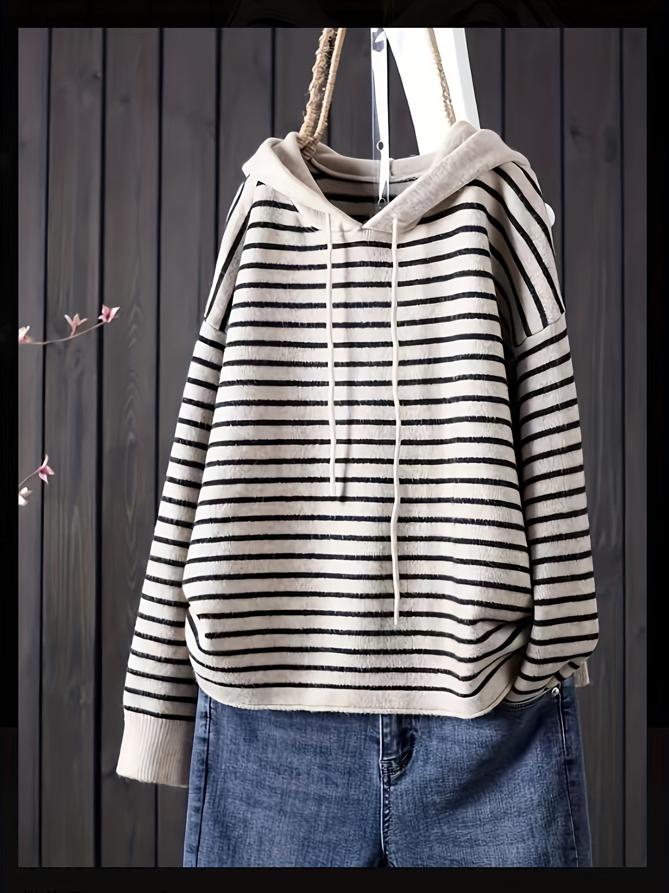 Plus Size, Plus Size Women's Elegant Oversized Hooded Sweater - Beige & Black White Striped Cardigan Jacket, Soft -like Texture Pullover for Spring/Fall Layering, Casual to Dressy Wear (No)