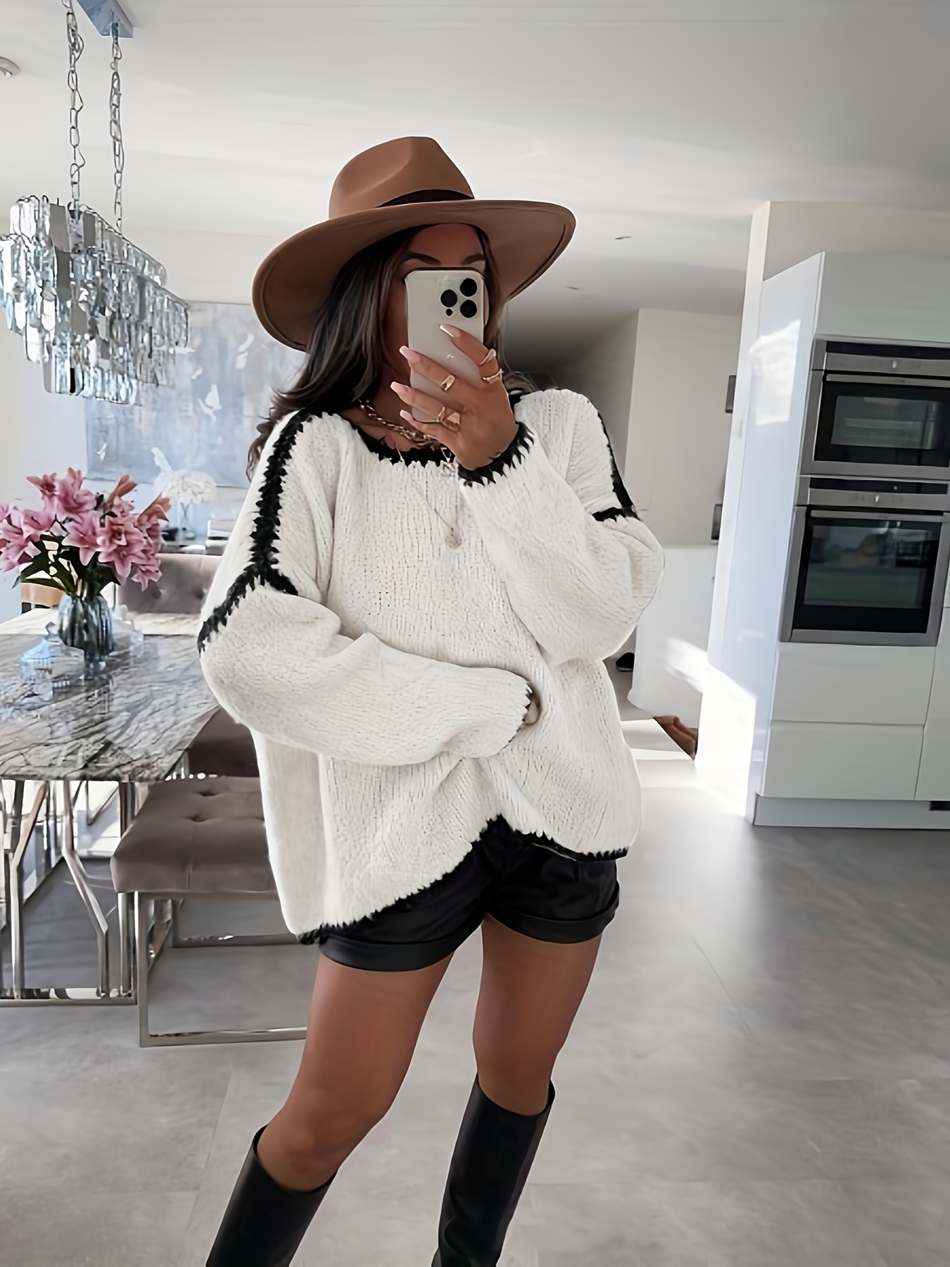 Plus Size - Women'S Casual Long Sleeve Pullover Sweater with Contrast Trim - Loose Fit, Round Neck, Medium Stretch, Striped Pattern, All-Season Comfort, Casual Wear|Striped Sweater|Medium Stretch Fabric