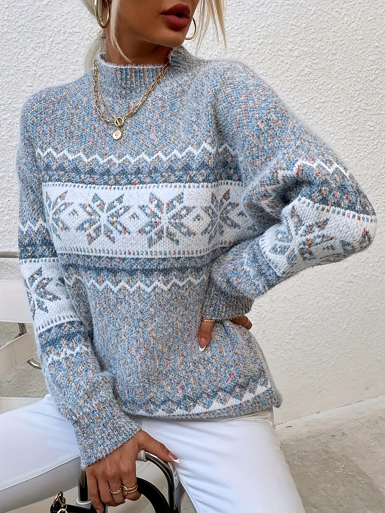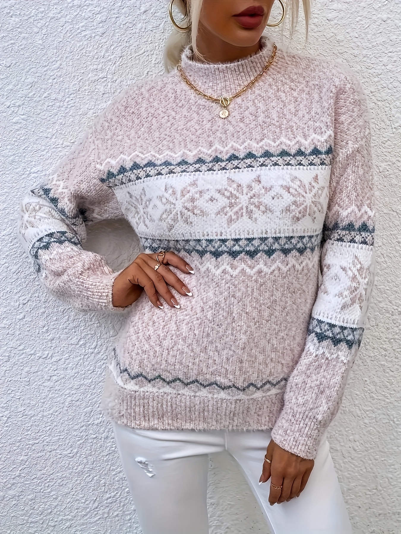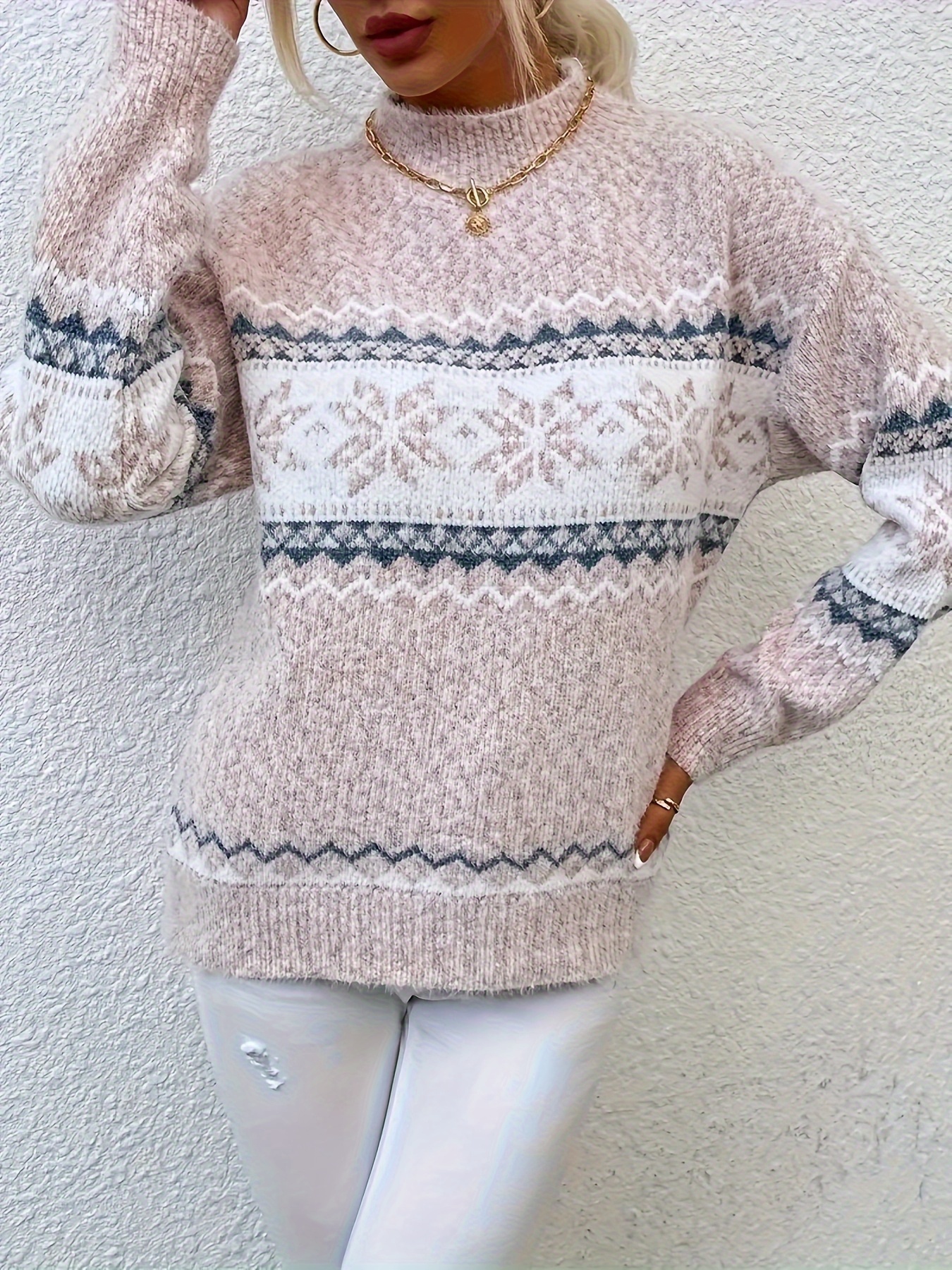 Plus Size, Women's Plus Size Winter Sweater Sweater Vest-like Long Sleeve Tunic - Soft Stretchy Turtleneck Sweater Coat with Snowflake & Print (Blue/White/Pink/Brown) - Cozy Christmas Party & Casual Outfits for Cold Weather - Plus