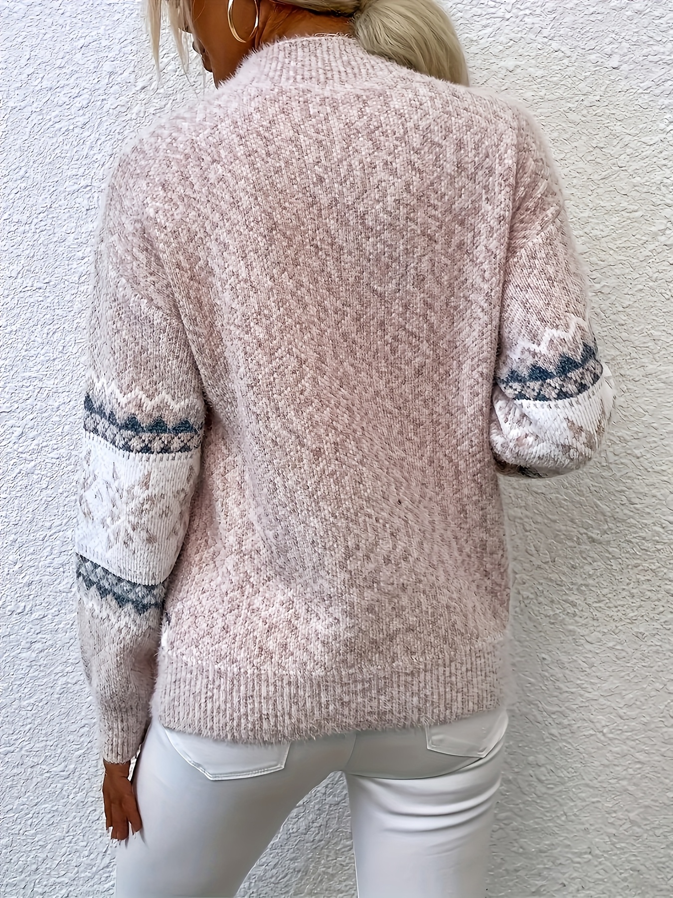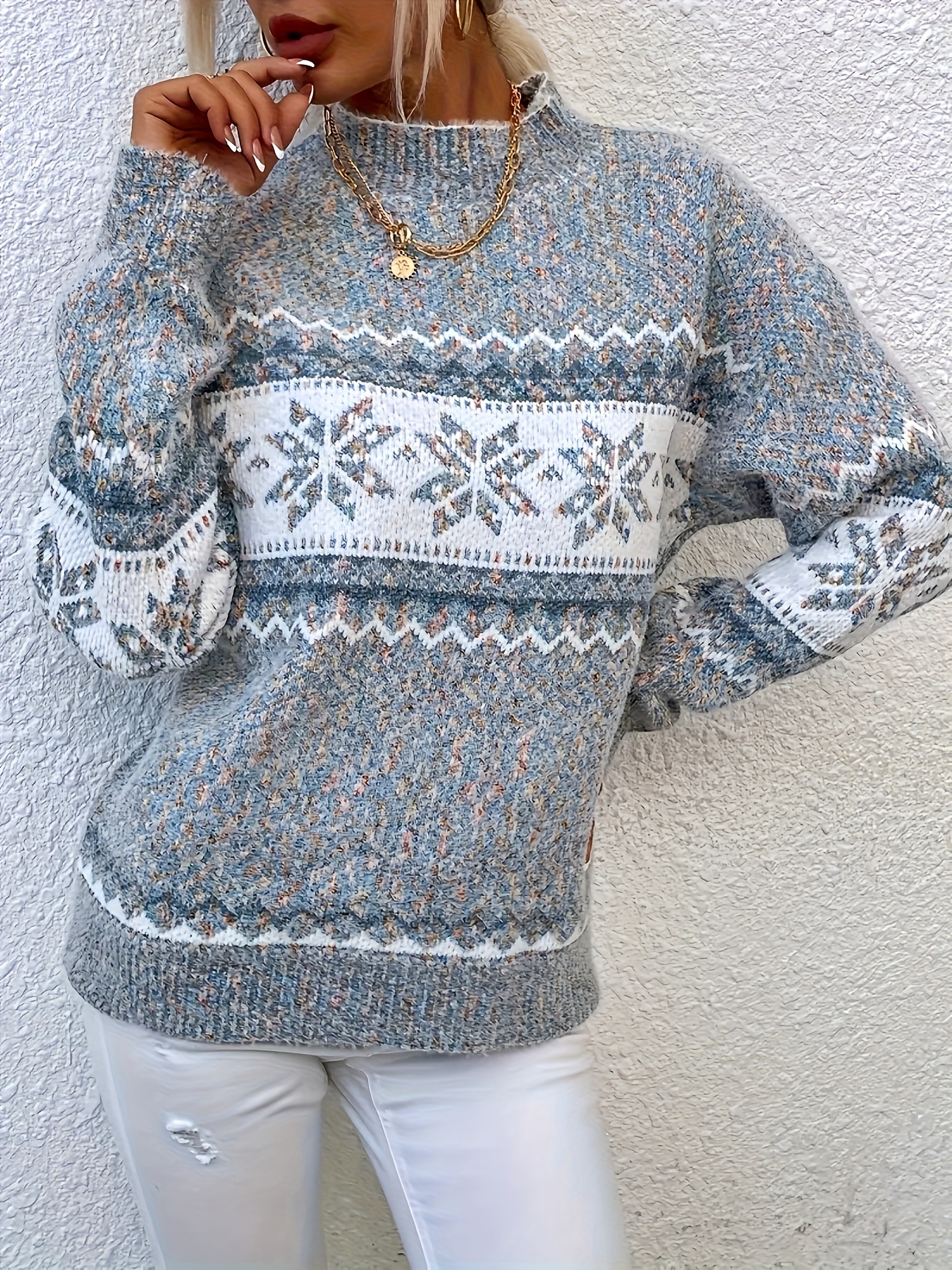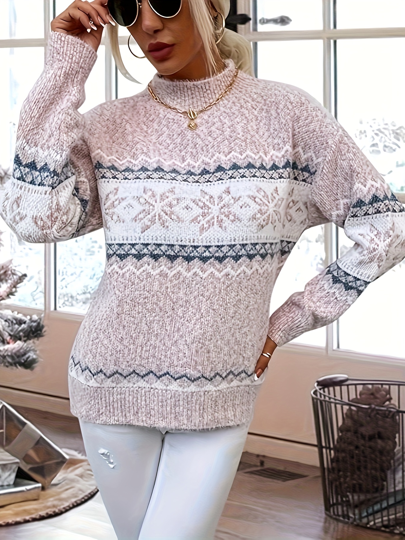 Plus Size, Women's Plus Size Winter Sweater Sweater Vest-like Long Sleeve Tunic - Soft Stretchy Turtleneck Sweater Coat with Snowflake & Print (Blue/White/Pink/Brown) - Cozy Christmas Party & Casual Outfits for Cold Weather - Plus