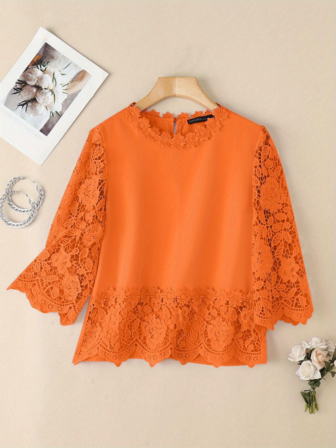 [Elegant Oversized Blouse] Plus Size, ZANZEA Women's Plus Size Elegant Oversized Blouse - Lightweight Short Sleeve-Like 3/4 Sleeve Crew Neck Shirt, Wrinkle-Resistant White & Colors, Structured Collar, Machine Washable - Office, Commuter & Casual Wear (No Stretch)