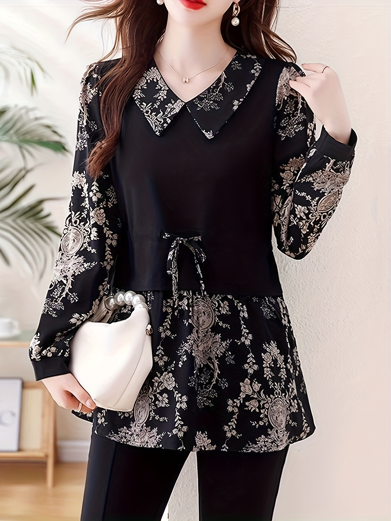 [Floral Print Blouse] Plus Size, Plus Size Floral Print Long Sleeve Shirt - Elegant Loose Fit H-Line Blouse With Contrast Collar & Drawstring Waist, Machine Washable Spring/Fall Top For Women, Casual Chic Wear, Sophisticated Pullover, Quality Casualwear