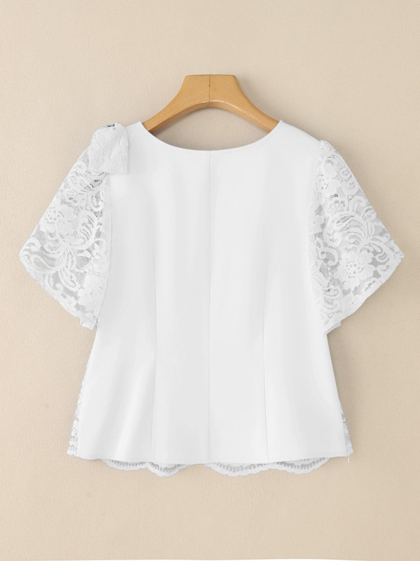 Plus Size, ZANZEA Women's Elegant Lace Patchwork Blouse - Short Sleeve Lace Collar & Sleeve Trim, Semi-Sheer Lace Panel Lightweight Summer Wedding Guest Dress Shirt, Plus Size Round Neck Blouse () for Party, Office, Casual - Machine